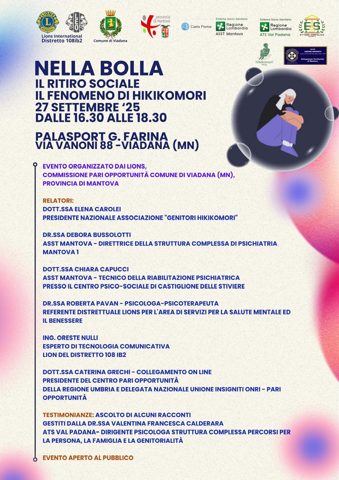 Grazie a un lavoro sinergico tra Provincia di Mantova, Commissione Pari Opportunità di Viadana, i Club Lions della provincia di Mantova e dell'Oglio Po, ASST di Mantova, ATS Valpadana, Associazione "Genitori Hikikomori", Unione Insigniti Ordine al Merito della Repubblica Italiana e Istituto Ettore Sanfelice di Viadana esperti si confronteranno sul tema.