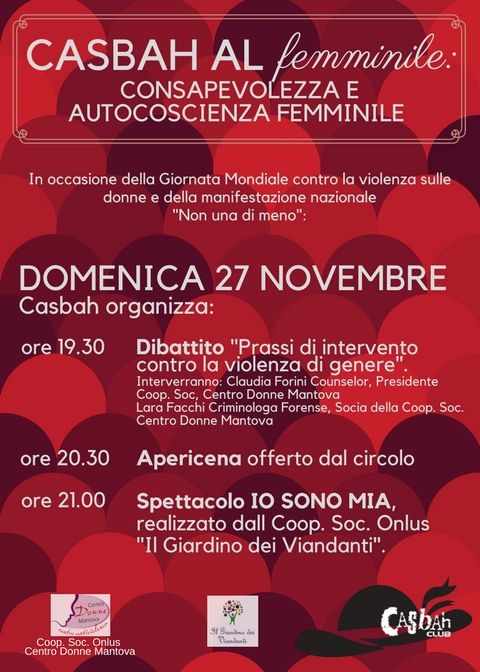 PEGOGNAGA : ''Casbah al femminile: Conoscenza e autocoscienza femminile'' alle ore 19.30 dibattito " Prassi d'intervento contro la violenza di genere" con interventi di Claudia Forini Counselor presidente Coop Soc. Centro Donne Mantova, Lara Facchi criminologa forense della Coop Soc. Centro Donne Mantova. A seguire apericena offerto dal circolo Casbah Club e spettacolo ''Io sono mia'', realizzato dalla Cooperativa Sociale onlus ''Il Giardino dei Viandanti''