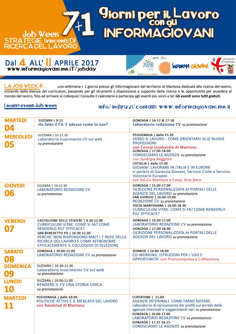 Per 8 giorni, dal 4 all'11 aprile i gli Informagiovani di Curtatone, Gonzaga, Ostiglia, Pegognaga, San Benedetto Po, Sermide, San Giorgio, Suzzara e l'Informagiovani Itinerante Alto Mantovano Distretto di Guidizzolo, organizzano approfondimenti legati al lavoro, tema ben conosciuto e sempre presente negli Informagiovani della provincia che solo nel 2016 hanno registrato oltre 17.500 contatti con più di 12.300 richieste legate alla ricerca di una professione.