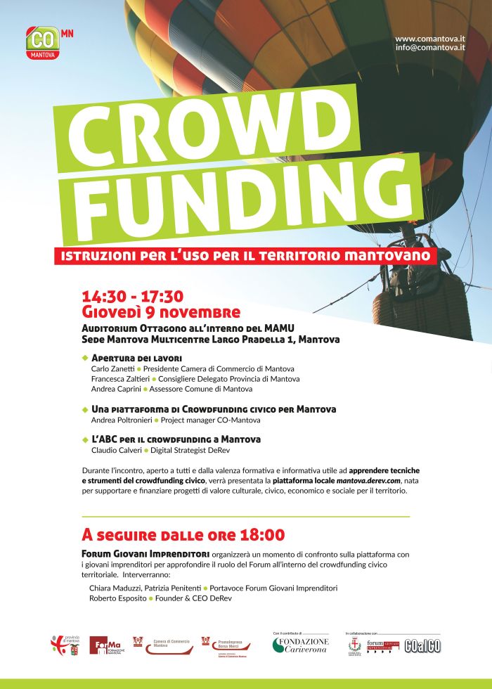 Si entrerà poi nel vivo del tema della piattaforma mantovana di crowdfunding e delle istruzioni da seguire per accedervi, con gli interventi, rispettivamente, di Andrea Poltronieri, project manager di CO-Mantova, e di Claudio Calveri, digital strategist di DeRev.